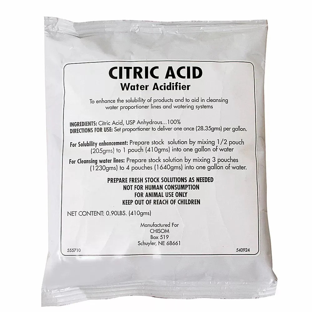 Citric Acid is used to increase solubility of tetracyclines when used in swine and poultry drinking water. Citric Acid can also used as a waterline cleaner and antimicrobial. Two-year shelf life.
