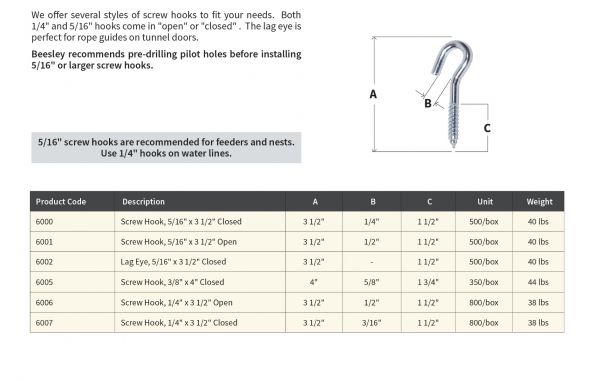 We offer several styles of screw hooks to fit your needs. Both 1/4″ and 5/16″ hooks come in “open” or “closed” . The lag eye is perfect for rope guides on tunnel doors.